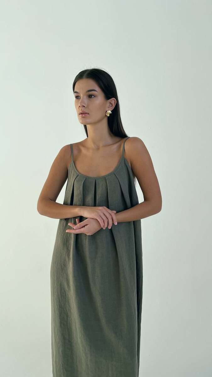 Тонкие бретели переходят в кулиску по спинке и регулируются завязывающимся бантом. Модель выполнена из умягченного льна в нежном шалфейном оттенке🌱