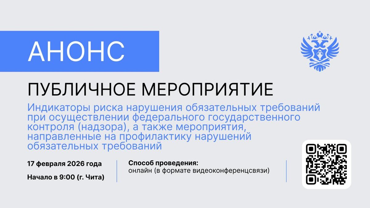 сообщает, что 17 февраля 2026 года в 9:00 (Чита, Забайкальский край) совместно с Региональной службой по тарифам и ценообразованию Забайкальского края планирует проведение публичного мероприятия. ▶️ Тема мероприятия «Индикаторы риска нарушения обязательных требований при осуществлении федерального государственного контроля (надзора), а также мероприятия, направленные на профилактику нарушений обязательных требований». Публичное мероприятие состоится в формате видеоконференцсвязи. 📌 Подробнее о мероприятии и регистрации на сайте: https://clck.ru/3RaKU2 #Анонс #ДФО Росалкогольтабакконтроль МАХ | ВКонтакте | Telegram