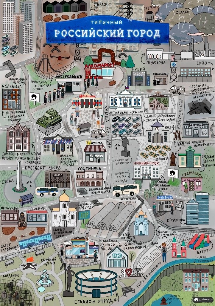 Представьте карту повседневности — такую, где каждый уголок рассказывает свою историю. Именно таким предстаёт «типичный российский город» на этой забавной, но удивительно точной иллюстрации! 🏘️