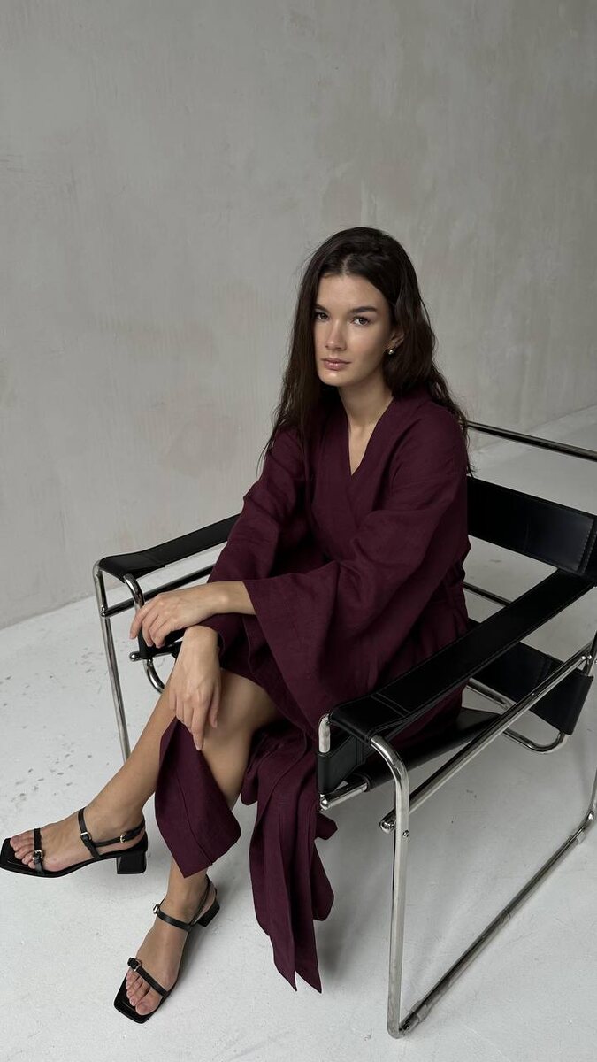 Эффектное длинное кимоно в благородном оттенке BURGUNDY: широкие рукава с асимметричным краем, свободная посадка и пояс, подчеркивающий талию.