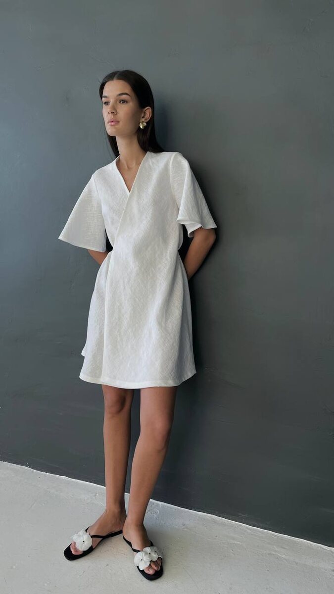 Платье в длине мини WHITE: модель с запахом обеспечивает комфортную посадку в талии, а крой по косой подчеркивает силуэт, придавая образу воздушность🌾