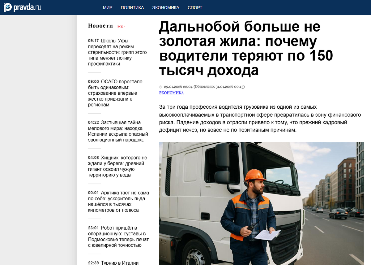Член Общественного совета Ространснадзора Владимир Матягин о профессии водителя грузовика. Pravda.ru, 29.01.2026