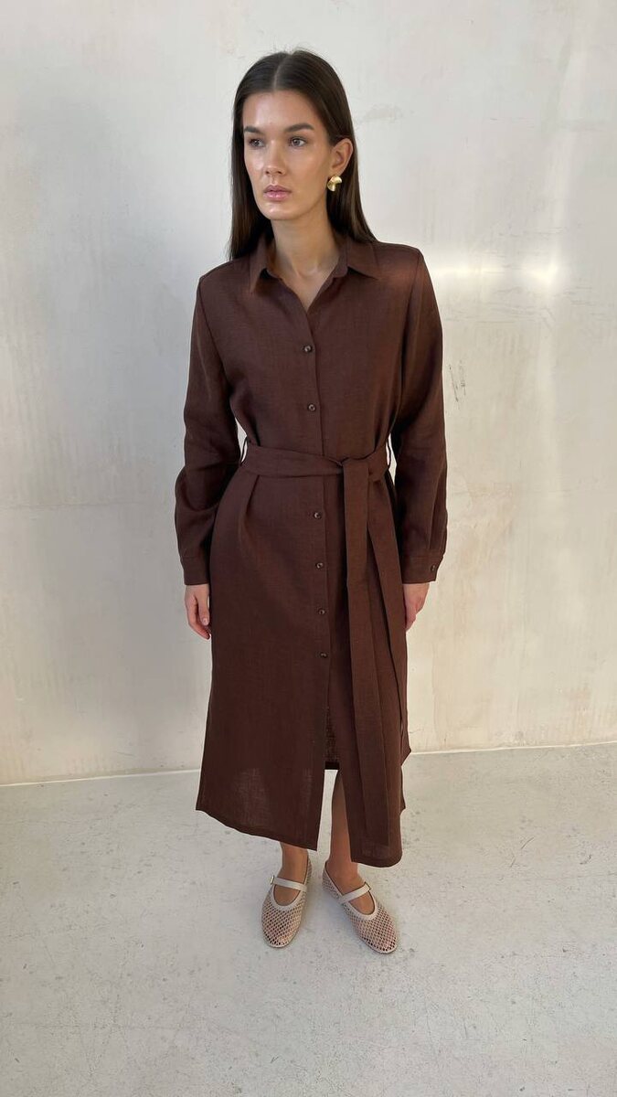 Шоколадное платье-рубашка в длине миди с боковыми разрезами и поясом в комплекте: лаконичный крой и универсальная расцветка сделают его незаменимой базой в вашем гардеробе.
