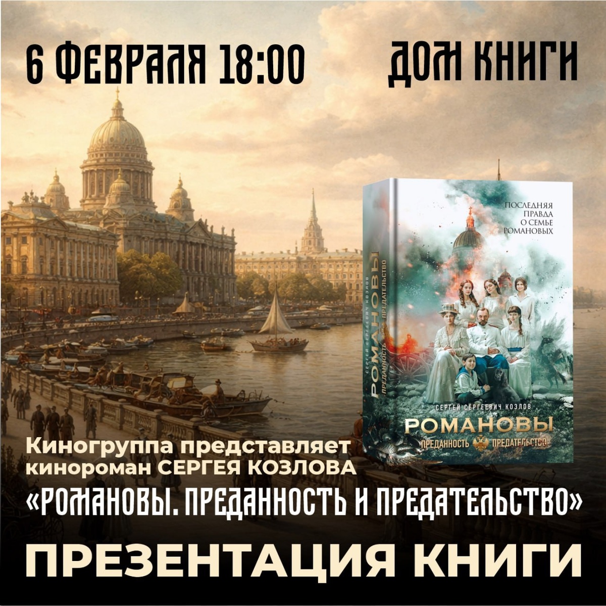 Киногруппа представляет кинороман Сергея Козлова “Романовы. Преданность и предательство”. Захватывающий авантюрный роман на стыке документалистики и вымысла. Перед читателем оживают судьбы великих и простых людей: династия Романовых, офицеры-заговорщики, Григорий Распутин, епископ Гермоген, европейские правители и цареубийцы. Тайны и трагедия последней правящей царской семьи. По роману снят эпический одноименный кинофильм. На встрече вы узнаете историю создания романа, необычные факты, интересные подробности о съемках фильма, проникнетесь невероятной атмосферой николаевской эпохи. Несомненно, что даже те, кто считает себя знатоком этого драматического периода русской истории, откроют для себя немало нового. Спикеры встречи: Режиссер фильма Василий Чигинский,автор идеи проекта и продюсер Олег Урушев, актер Сергей Яценюк. Ждем вас 6 февраля , в 18:00. Дом книги, Невский, 28 Читай нас в MAX! | Читай нас в Telegram