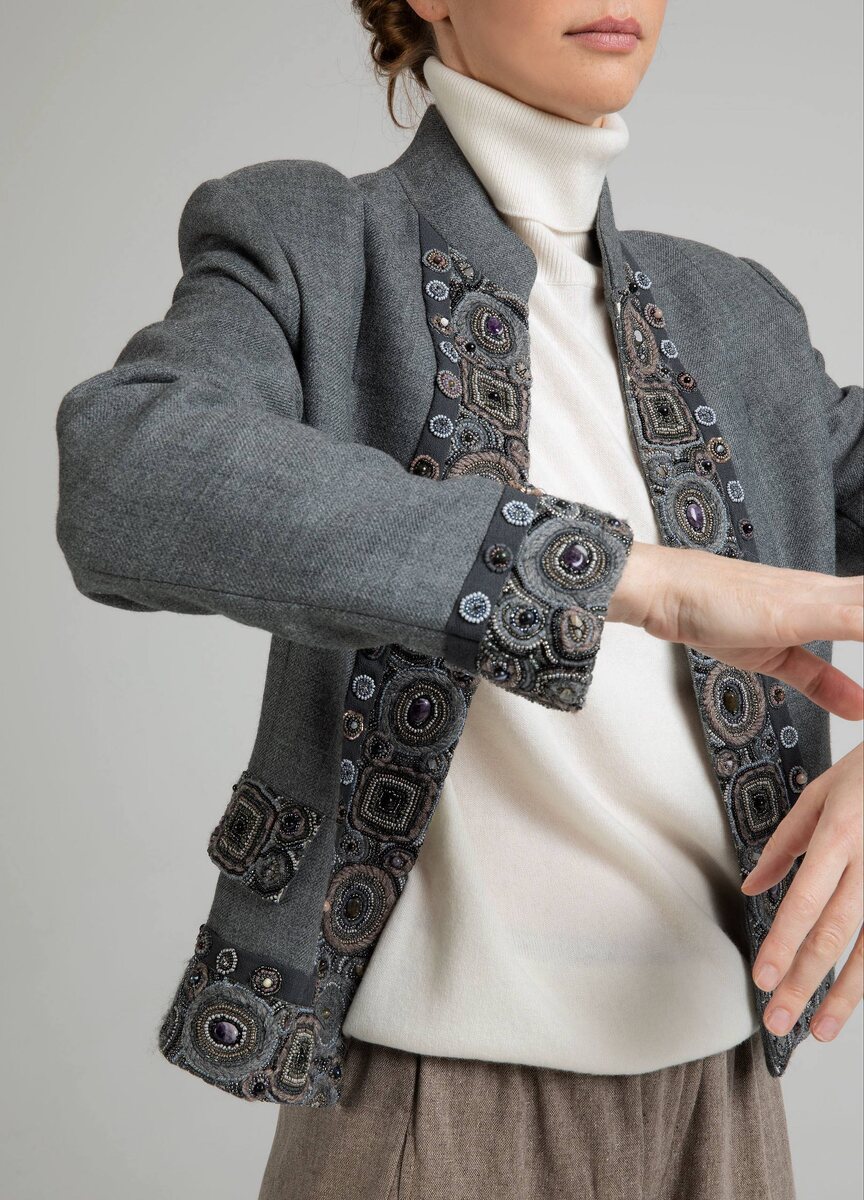 2. Александра Георгиева добавляет акцент на вышивку в технике крестецкой строчки. Крестецкая строчка — это особый вид русской вышивки с уникальной техникой, имеющая свои характерные особенности.
