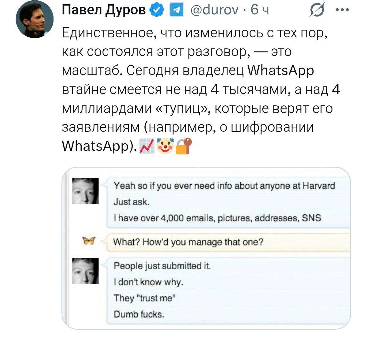 Цукерберг смеется над пользователями WhatsApp, которые доверяют его заявлениям о безопасности мессенджера Он опубликовал скриншот переписки 2004 года В сообщениях разработчик утверждает, что может передать собеседнику данные 4000 студентов Гарварда, зарегистрировавшихся в Facebook(пренадлежит Meta, признаной экстремистской организацией, ее деятельность запрещена в России) На вопрос о происхождении этих данных Цукерберг отвечает: «Люди сами их предоставили… Они “доверяют мне”… Тупицы» Переписка стала публичной лишь в 2010 году — она фигурировала в материалах одного из судов над Цукербергом По словам Павла Дурова, теперь изменился только масштаб происходящего Владелец WhatsApp втайне смеется уже не над 4 тысячами, а над 4 миллиардами “тупиц”, которые верят его заявлениям — например, о шифровании WhatsApp Telegram | Дзен | MAX