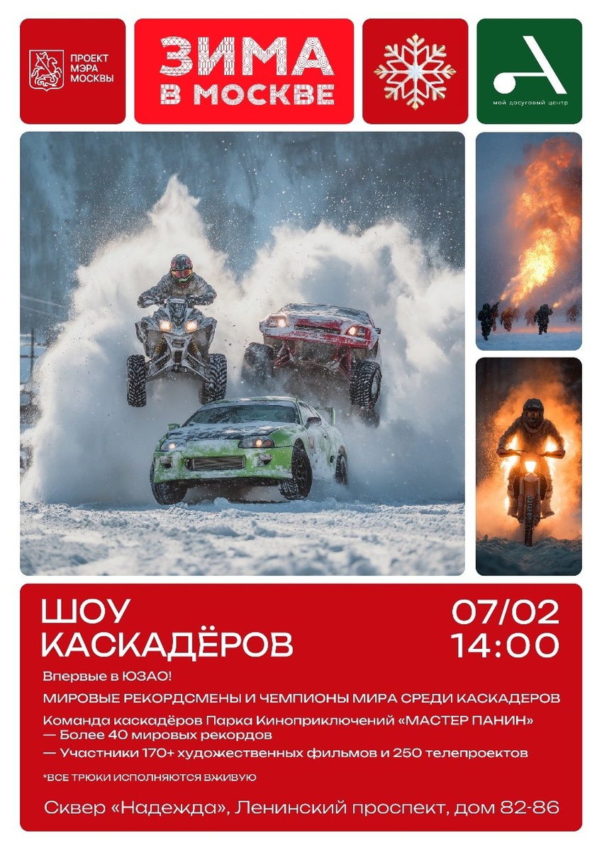 7 февраля в 14:00 в парке «Надежда», расположенном на Ленинском проспекте (владение 82–86), состоится захватывающее «Шоу каскадеров» от команды Парка Киноприключений Мастера Панина. Зрителей ждут мировые рекорды, адреналин и огненные трюки в исполнении лучших профессионалов. В шоу примут участие признанные чемпионы и авторы уникальных номеров. Среди них — виртуоз паркура Павел «Пабло» Иванов, известный своими победами в проектах «Супер Ниндзя» и «Кардо». Его выступление продемонстрирует высочайший уровень владения телом и пространством, характерный для трейсеров. Также на площадке выступят Олег «Танкист» Ефимов, чемпион фестиваля «Прометей-2014» и участник церемонии открытия Олимпиады в Сочи, и Олег «Ясвами» Грачев — профессиональный автогонщик и мастер дрифта. #паркур #кардо #сочи Подробнее...