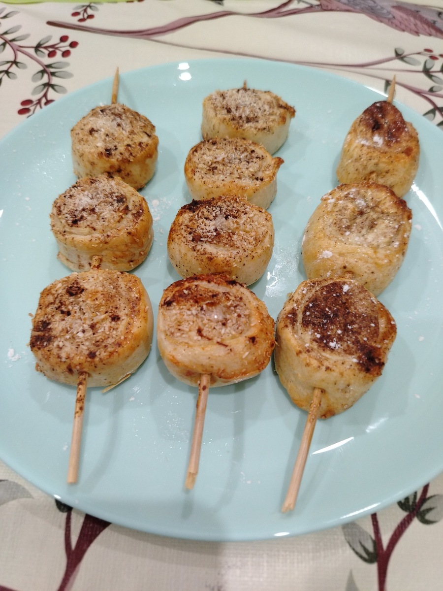 Раскатать тесто. Завернуть в него бананы. Разрезать. Нанизать на шпажки.