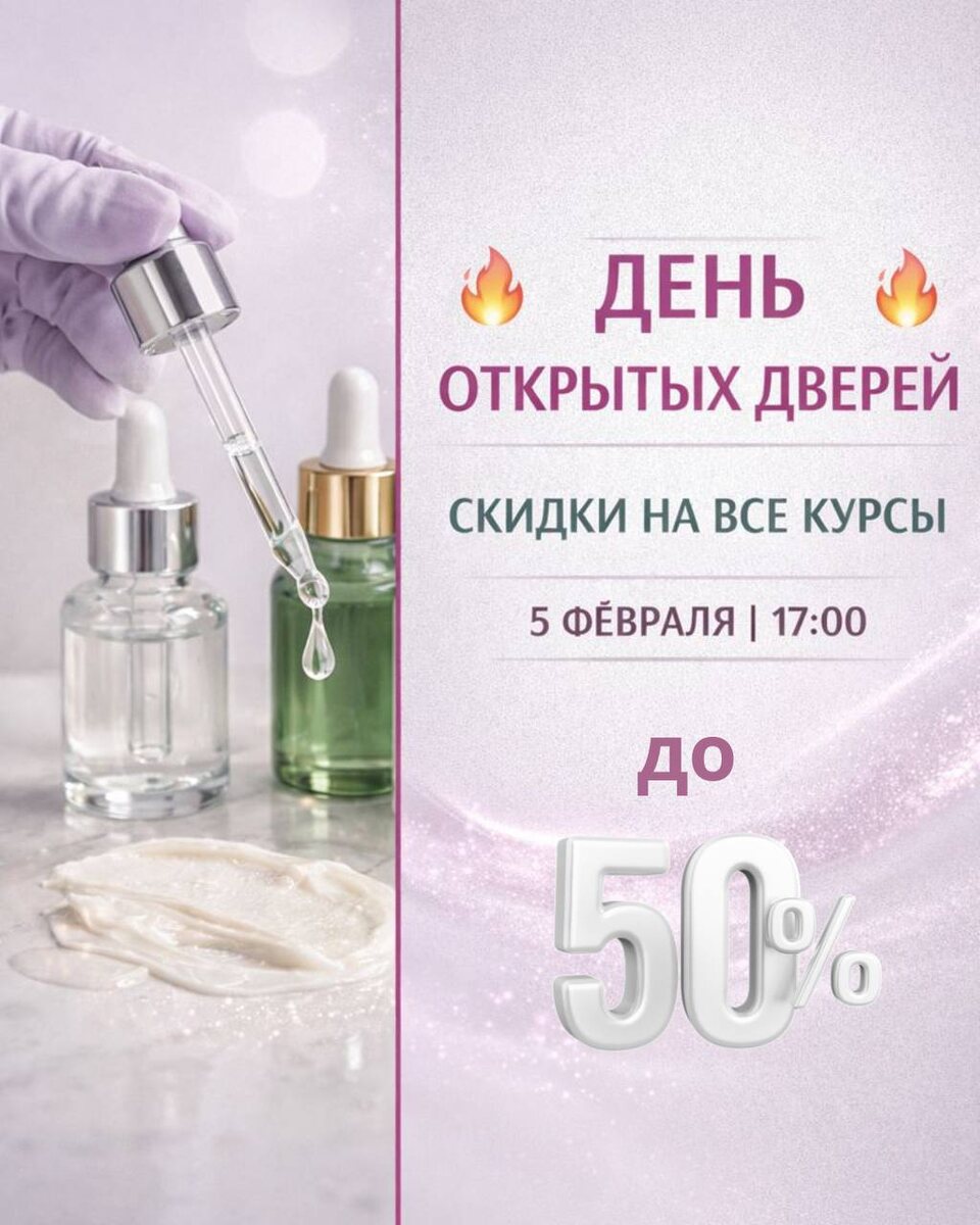 ! 💣 ПИЛИНГОВЫЕ ПРОТОКОЛЫ из Израиля: детокс, ревитализация и атравматичность. 📅 5 февраля в 17:00 ждем вас на нашем мероприятии с невероятными скидками на ВСЕ курсы обучения! Скидки! 💫30% на все длительные и краткосрочные курсы 💫20% на все дистанционные курсы 💫50% по теме мастер-класса на все курсы по пилингам!!!! 💫Бонус для гостей: Бесплатный мастер-класс по применению пилинговых систем марки SR Cosmetics: шелковый и томатный пилинги. 📌 Программа Дня открытых дверей: ✔ Презентация программ обучения ✔ Карьерный консалтинг ✔ Мастер-класс 💯 И конечно: фуршет и возможность получить скидки! ☝🏻Вход только по предварительной записи! 📲 Запись и вопросы ➡️ в комментарии и лс 👉🏻 Не можете присутствовать? Оставьте контакт, и наш менеджер поможет вам выбрать курс и оформить заявку. 🌟 Станьте профессионалом в бьюти-сфере с максимальной выгодой 🔥 Ждем вас!🔥