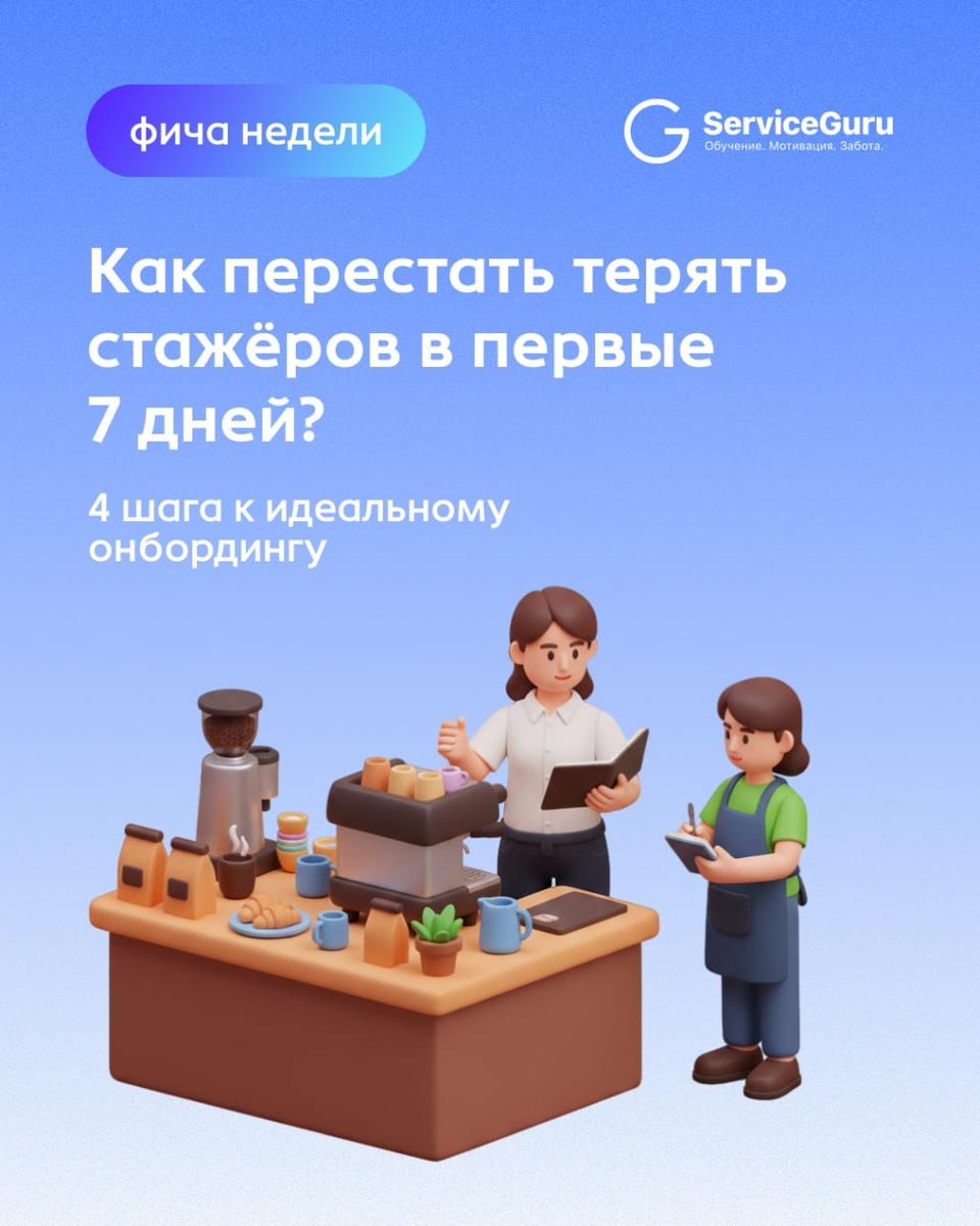 ? 🚀 📉 Первый месяц — критический этап. В ритейле и общепите доля сотрудников, покидающих компанию в первые 30 дней, достигает 25%. Самый опасный период — первая неделя: именно тогда новичок сталкивается с хаосом, стрессом и несовпадением ожиданий с реальностью. Как ServiceGuru превращает этот квест в понятный путь, ускоряет адаптацию и снижает текучку на старте в разы? Помогают эти 4 инструмента 👇 1️⃣ Пребординг 2️⃣ Welcome-курс 3️⃣ Лента новостей 4️⃣ Автоматическая адаптация с push-уведомлениями Листайте карточки, чтобы узнать, как внедрить это у себя! 👆 Бесплатный доступ к платформе ServiceGuru на 14 дней! #фича_недели