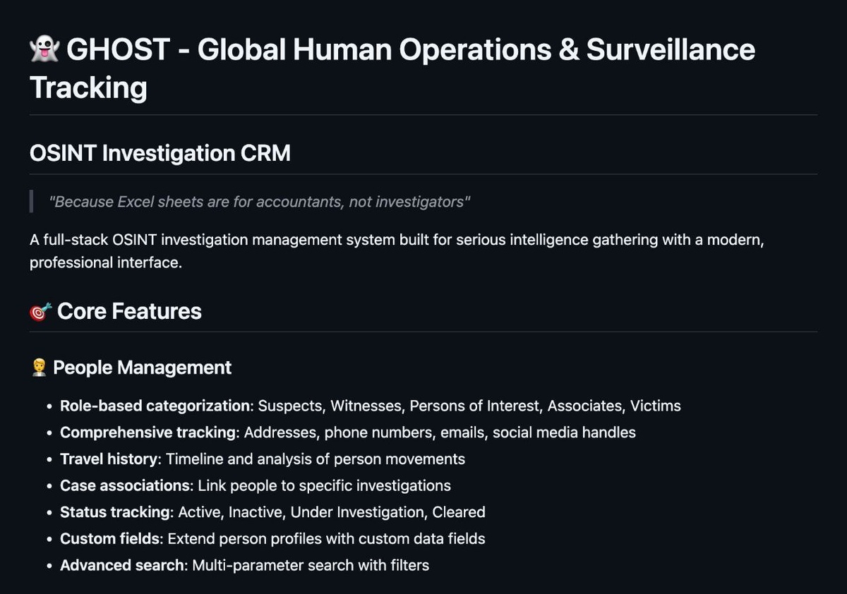 🔍🕵️♂️ Забудь про Excel-таблицы с именами и датами рождения — это для бухгалтеров, а не для тех, кто видит мир через призму OSINT. GHOST — король цифрового розыска, который превращает хаос открытых данных в структурированную карту влияния, связей и передвижений цели. 🔥 Что он умеет? — Раскладывает личность по полочкам: телефоны, почты, адреса, соцсети, работа, статус — всё в одном профиле. — Строит граф связей как в сериале «Метод»: кто друг, кто враг, кто просто сосед по подъезду. — Отслеживает перемещения по геолокации, Wi-Fi сетям (да-да, даже из WiGLE!), и отображает всё на интерактивной карте с кластеризацией. — Поддерживает мульти-кейсы: пробивай десятки целей, связывай их в единую сеть, находи скрытые связи. — Интегрирует OSINT-инструменты прямо в интерфейс: один клик — и ты уже в поиске по базам, соцсетям или даркнет-зеркалам (ну, почти 😏). — Красиво, быстро, в тёмной теме и с анимациями Apple-уровня — потому что шпионство должно быть эстетичным 💅. И всё это — бесплатно,