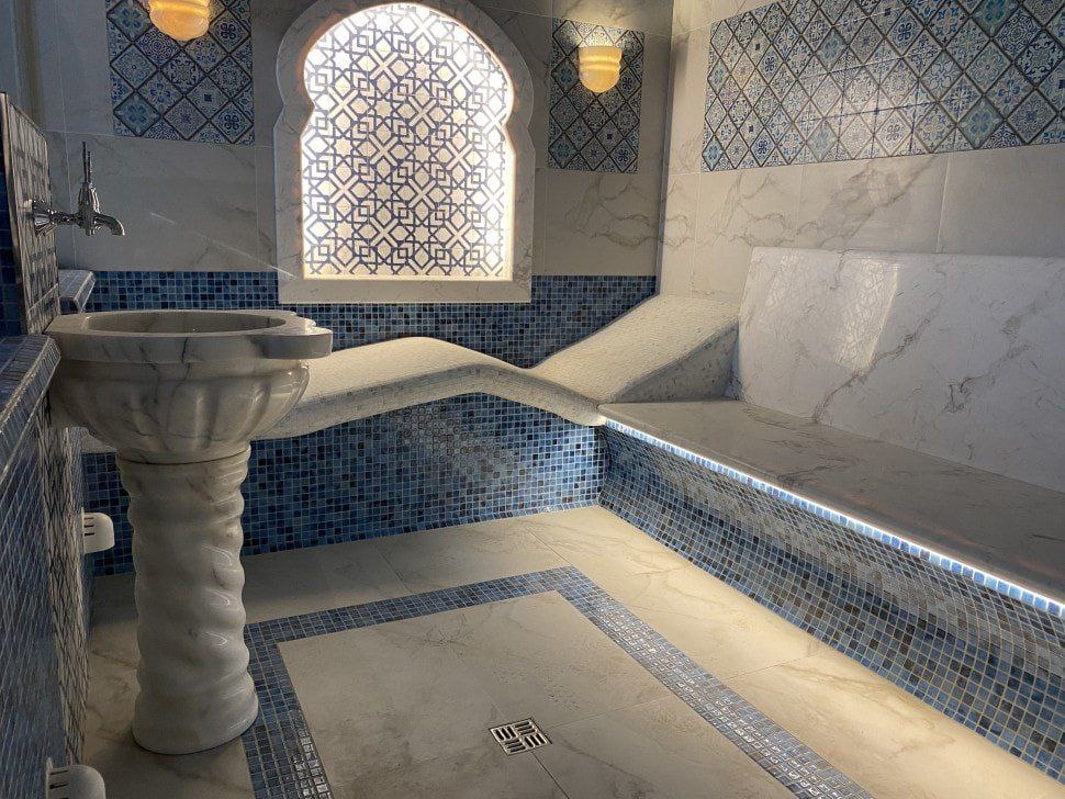 Классический стиль хамама с отделкой в сине-белых оттенках, создает атмосферу уюта и комфорта. В таком интерьере можно расслабиться и отдохнуть после тяжелого дня. Специально для данного проекта мы изготовили из мрамора курну КМ25 на винтовом пьедестале СМ03, а также настенные светильники МС02. По вопросам строительства, приобретения и технических консультаций пишите нам в Telegram: https://t.me/+79857763352. С уважением, Ольга. 👉подписывайтесь на канал (https://dzen.ru/id/5ea691c66135402f75337cd2)👈