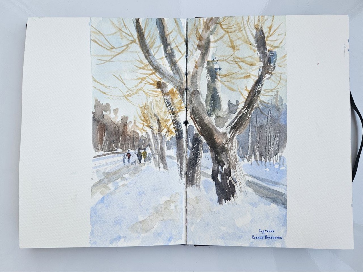 ❄️🌴 Сегодня хочу показать вам страничку из моего скетчбука! На ней я запечатлела волшебство февраля своего родного города 😍 Февраль у нас особенный - серо-голубое небо, чистый воздух и эти потрясающие тополя с изящными ветвями-паутинками. Они такие классные - высокие, стройные стволы устремляются вверх, будто хотят достать до облаков 😍 А кто-то однажды прозвал их "северодвинскими пальмами" 🤣 Такое сравнение сразу согревает душу!☕❄ #скетчбук