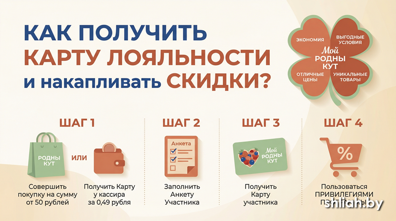 В магазинах потребительской кооперации иногда можно заметить небольшую очередь у специальных информационных стоек. Люди, чаще старшего возраста, внимательно изучают памятки и задают вопросы продавцам. Причина ажиотажа – социальная программа «Мой РОДНЫ КУТ», которую проводит Белорусский республиканский союз потребительских обществ. Её цель – помочь тем, для кого поход за продуктами давно стал статьёй расходов, требующей подсчёта каждой копейки. Сеть магазинов, где работает программа, широка, но не всеобъемлющая. Акции не будет в магазинах-дискаунтерах вроде «ProЗапас», «МЕГАопт» или в специализированных «Мясных лавках». Оформляем карту на месте «Пришла с пенсионным и паспортом, – делится у кассы Анна Ивановна. – Девушка-кассир выдала бланк, помогла заполнить. Через пару недель на телефон пришло смс, и можно было пользоваться. Карточку я купила тут же, за 49 копеек». Процедура для многих знакомая, но с важным нюансом. Социальная карта – именная и выдаётся только на один конкретный докуме