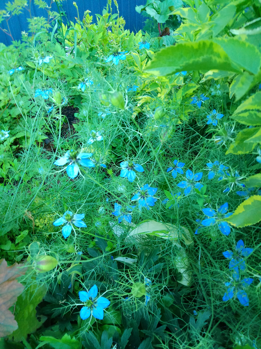 Нигелла, в саду растёт давно, нежное растение с ажурной листвой, сама сеется.
