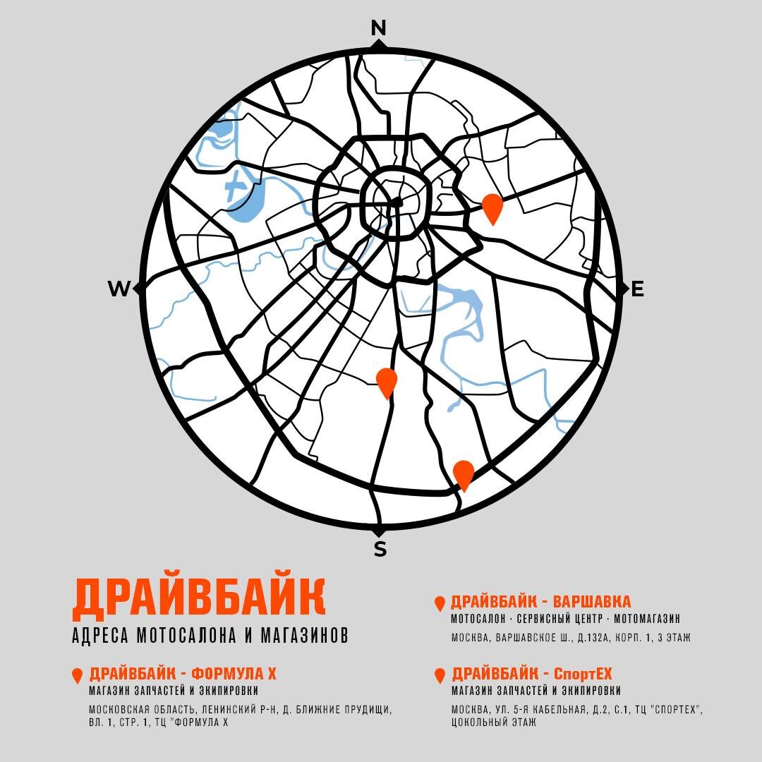 : • ДрайвБайк-Варшавка - Варшавское ш., д.132А, к.1 (магазин, дисконт, мотосалон, сервис) • ДрайвБайк-СпортЕХ - ул. 5-я Кабельная, д.2с1, ТЦ "СпортЕХ", цокольный этаж • ДрайвБайк-Формула Х - Ближние Прудищи, вл.1,стр.1, ТЦ «Формула X», 2 этаж Ждем в гости сегодня, завтра и всегда!