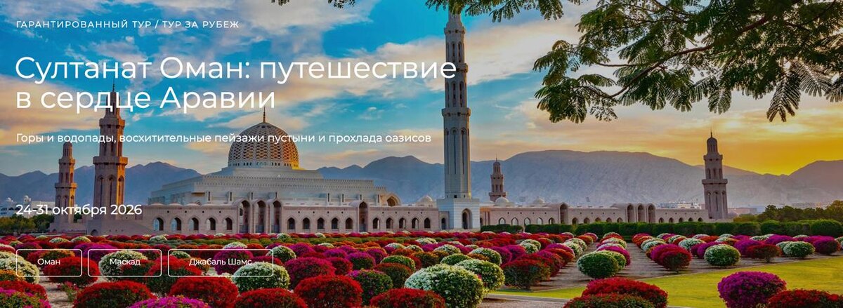 Оман — скрытая жемчужина Аравийского полуострова. Здесь соседствуют: ✅лазурное море и золотые пляжи; ✅ величественные горы и таинственные водопады; ✅бескрайние пустыни и зелёные оазисы. Это страна, где бережно хранят традиции, но при этом создают современную туристическую среду. Оман понравится тем, кто: ➡️ценит нетронутую природу; ➡️нтересуется древней историей; ➡️любит подводное плавание и морскую рыбалку (в местных водах — богатый подводный мир); ➡️хочет ощутить колорит Востока: переночевать в пустыне, исследовать старинные города, увидеть гигантских черепах. 📌Маршрут (кольцевой): Маскат → Низва → Мисфат‑аль‑Абрин → Джабаль Шамс → Бахля → Джибрин → пустыня Вахиба Сэндс → оазис Вади Бани Халид → Сур → Рас‑аль‑Жинз → Рас‑аль‑Хадд → Вади Шааб → Финс/Бима → Маскат. Перелёт: * авиакомпания: Oman Air; * вылет из Шереметьево; * туда: рейс WY 184, 22:20–05:40 (Москва → Маскат); * обратно: рейс WY 183, 15:25–21:00 (Маскат → Москва); * багаж: 23 кг + ручная кладь 7 кг. ❓Что взять с собой