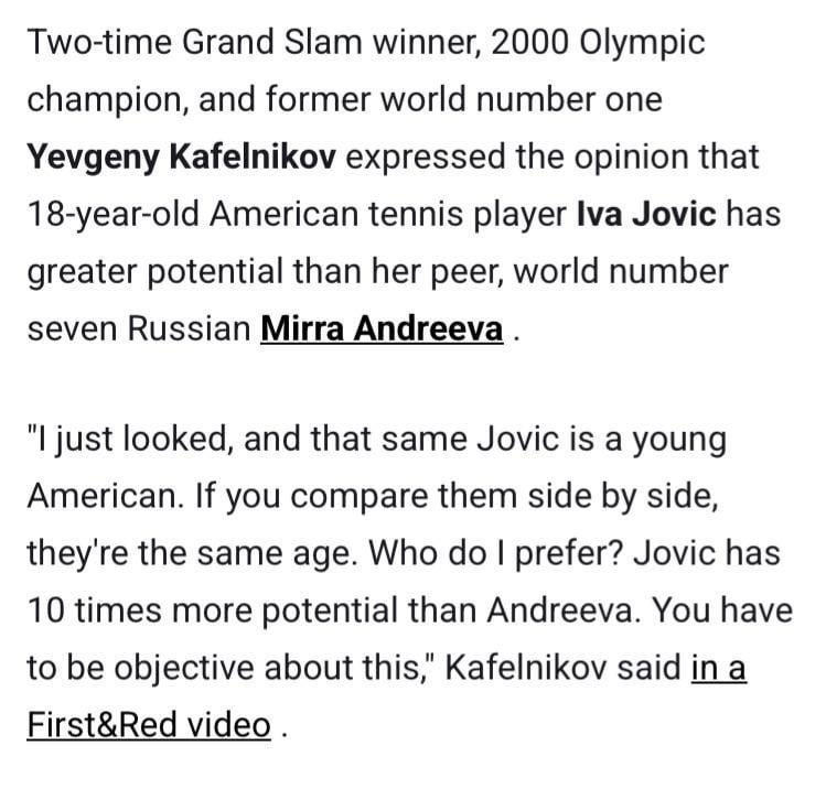 : 💬 «У Йович в 10 раз больше потенциала, чем у Андреевой. Надо быть объективным». Ранее он заявил, что у Мирры Андреевой нет будущего после ее поражения от Элины Свитолиной на Открытом чемпионате Австралии: 2:6, 4:6. 💬 «Нечего сказать об игре Мирры. С такой игрой бессмысленно рассчитывать на будущее. Учитывая, в какой теннис играет Андреева, этот результат предсказуем». Подпишись на Эйс и точка