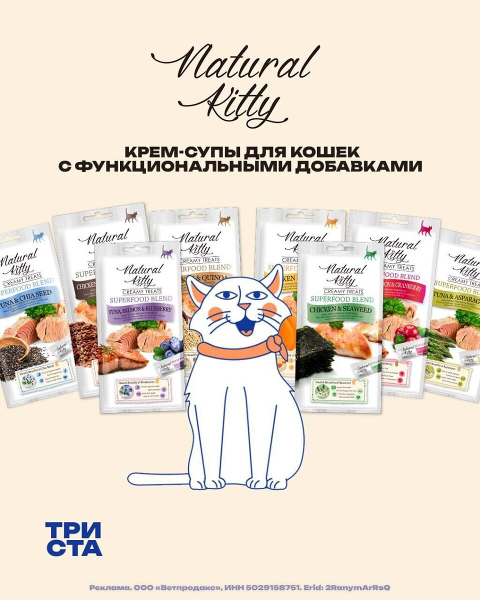 Современные владельцы все чаще выбирают продукты, которые просты в использовании: без мисок, без больших порций, в удобной упаковке, позволяющей дать лакомство за один раз. Именно поэтому формат крем-супов в стиках так быстро стал нормой на азиатских рынках, где петфуд легко конкурирует с обычной едой: открыл и легко выдавил – комфортно для питомца и удобно для человека. На этой логике построена новая линейка лакомств Natural Kitty Creamy Treats от Pettric – крем-супы для кошек с функциональными добавками. Natural Kitty – функциональное лакомство, в составе которого используются хорошо знакомые суперфуды: овощи, семена, ягоды, водоросли. Продукт закрывает сразу два запроса рынка – удовольствие для кошки и польза для ее организма. Формат и упаковка 😀 индивидуальные стики (крем-суп, легко выдавливается) 😀 потребительские паки по 4 стика – удобны для первой покупки и ротации вкусов 😀 крупные коробки до 50 стиков – для активных владельцев и семей с несколькими кошками 😀 четкая цвето