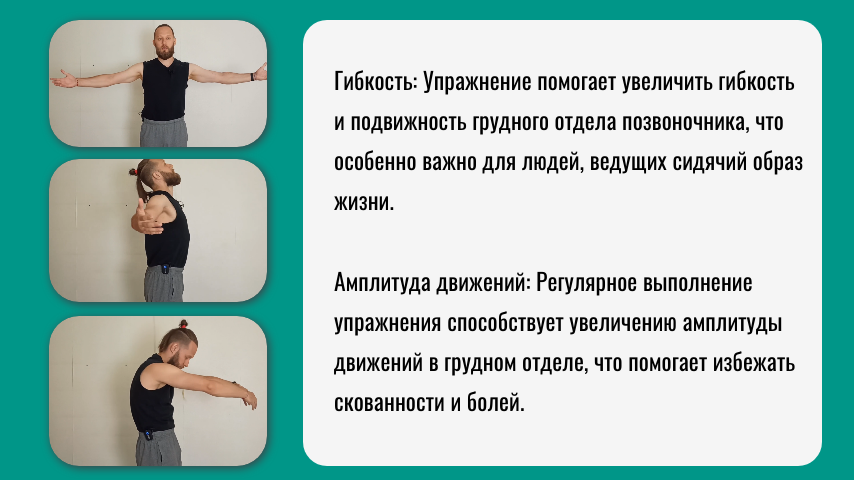 - Амплитуда движений: Регулярное выполнение упражнения способствует увеличению амплитуды движений в грудном отделе, что помогает избежать скованности и болей.