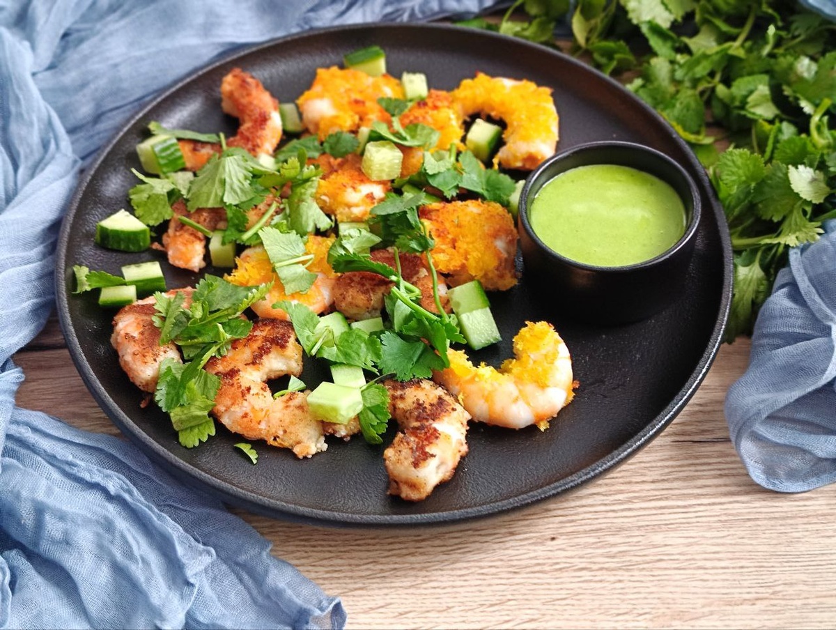 На 2 порции: Крупные креветки 750 г. Огурец 1 шт Кинза 20г. Миндальная мука ( для панировки) Яйцо 1 шт. Порошок васаби 5 гр. Вода 20 мл Масло растительное 100г. Сгущёнка 5 г. Соевый соус 5 г. Рисовый уксус 5 г. Краситель зелёный 1 г. Соль, перец по вкусу. Масло растительное для жарки. 1. Креветки размораживаем и очищаем. 2. Огурец режем кубиком. 3. Кинзу рубим ножом. 4. Готовим васаби майонез: Воду смешиваем с порошком васаби. Добавляем желток, отделённый от белка. ( Белок нам потребуется для панировки) Взбиваем всё миксером. Постепенно вливаем растительное масло и продолжаем взбивать. Добавляем соевый соус, рисовый уксус, соль, сгущёнку и краситель. Тщательно перемешиваем. 5. Креветки солим и перчим. 6. Обмакиваем креветки в яичный белок. 7. Обваливаем в миндальной муке. 8. Жарим с двух сторон по 1 минуте на растительном масле. 9. Подача: выкладываем креветки на тарелку. Посыпаем кубиками огурца и кинзой. Подаем с васаби- майонезом. Приятного аппетита!
