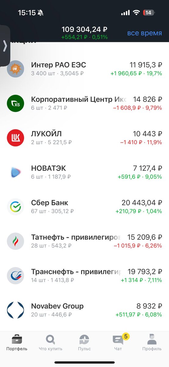 День #289 💰 Приветствую! На рынке и в новостях по большому счету тишина, никаких крупных событий не происходит, разве что Т-технологии планируют провести сплит своих акций 1к10, то есть вместо 3 300 руб. за штуку - можно будет приобрести за 330 руб. В целом удобно, особенно для небольших портфелей, как у меня Сегодня пополнил свой счет на 450 руб., но покупать ничего не планирую, т.к., хочу накопить нужную сумму для покупки еще одной акции Новатэка 🔋. Их доля в портфеле слишком мала, хотелось бы их нарастить, в моем понимании - перспективы у них неплохие Также, сегодня выходят данные росстата по недельной инфляции, завтра отследим эту статистику Пока на рынке затишье, не особо интересно, но это и не минус. Когда тихо и спокойно - лучше всего набирать себе позиции в акциях, без какой-либо паники и суеты Всем отличного дня и прекрасного настроения ! ❤️ Ссылка на чат канала - присоединяйтесь • Стоимость портфеля: 109 304.24 руб. • Сумма вложений: 105 200 руб. • Дивиденды/купоны за