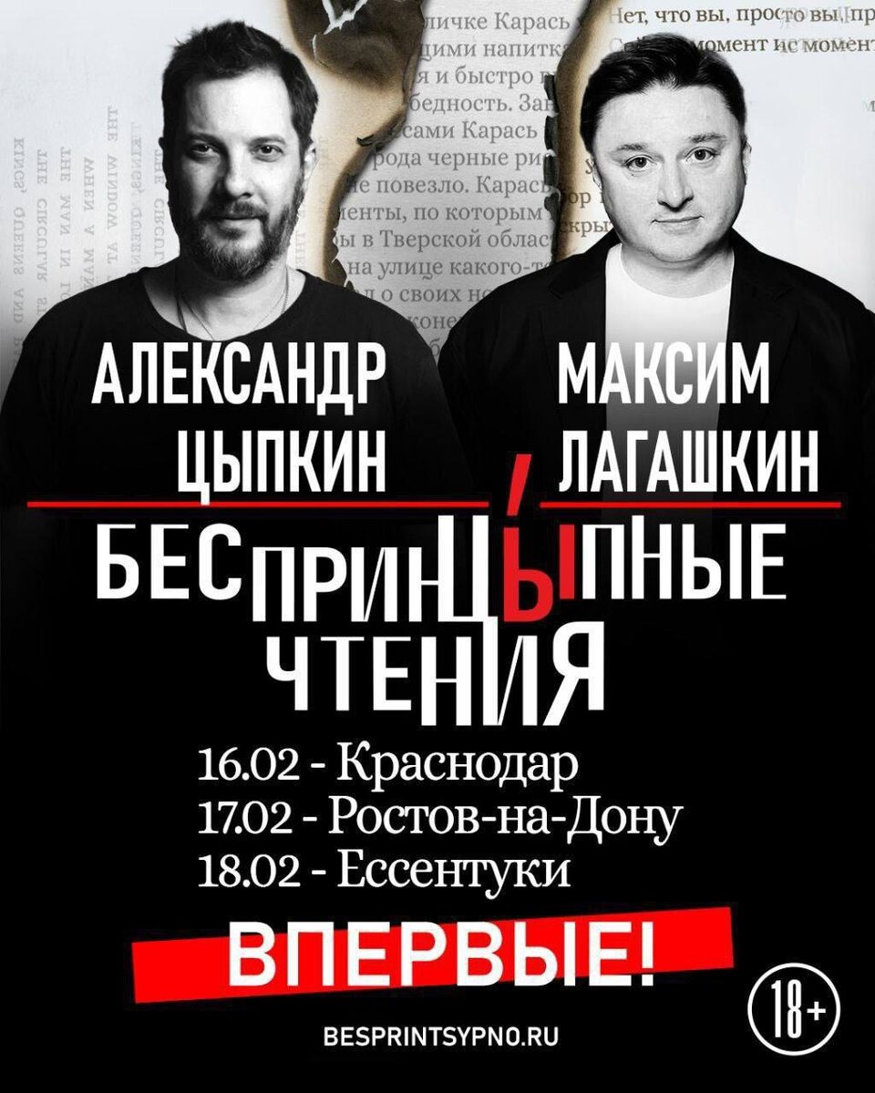 Не могу больше мерзнуть – еду на юг. Одному скучно, поэтому едем с Максимом Лагашкиным. А что делать на юге? Море пока холодное. Будем читать рассказы программы «Старый добрый Цыпкин» – согревать себя и публику. Рассказы как новые, так и известные. В одном городе не задерживаемся: 16 февраля – Краснодар 17 февраля – Ростов-на-Дону 18 февраля – Ессентуки Полная афиша чтений по ссылке.