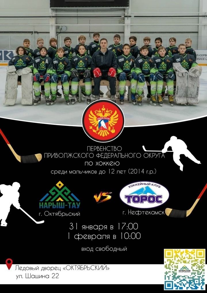 31 января и 1 февраля в ледовом дворце «Октябрьский» пройдут две игры второго этапа Первенства Приволжского федерального округа по хоккею среди мальчиков до 12 лет. На домашнем льду октябрьская команда «Нарыш-Тау» встретится с командой «Торос» из Нефтекамска. Игра в субботу начнётся в 17.00, в воскресенье — в 10.00. Вход свободный.