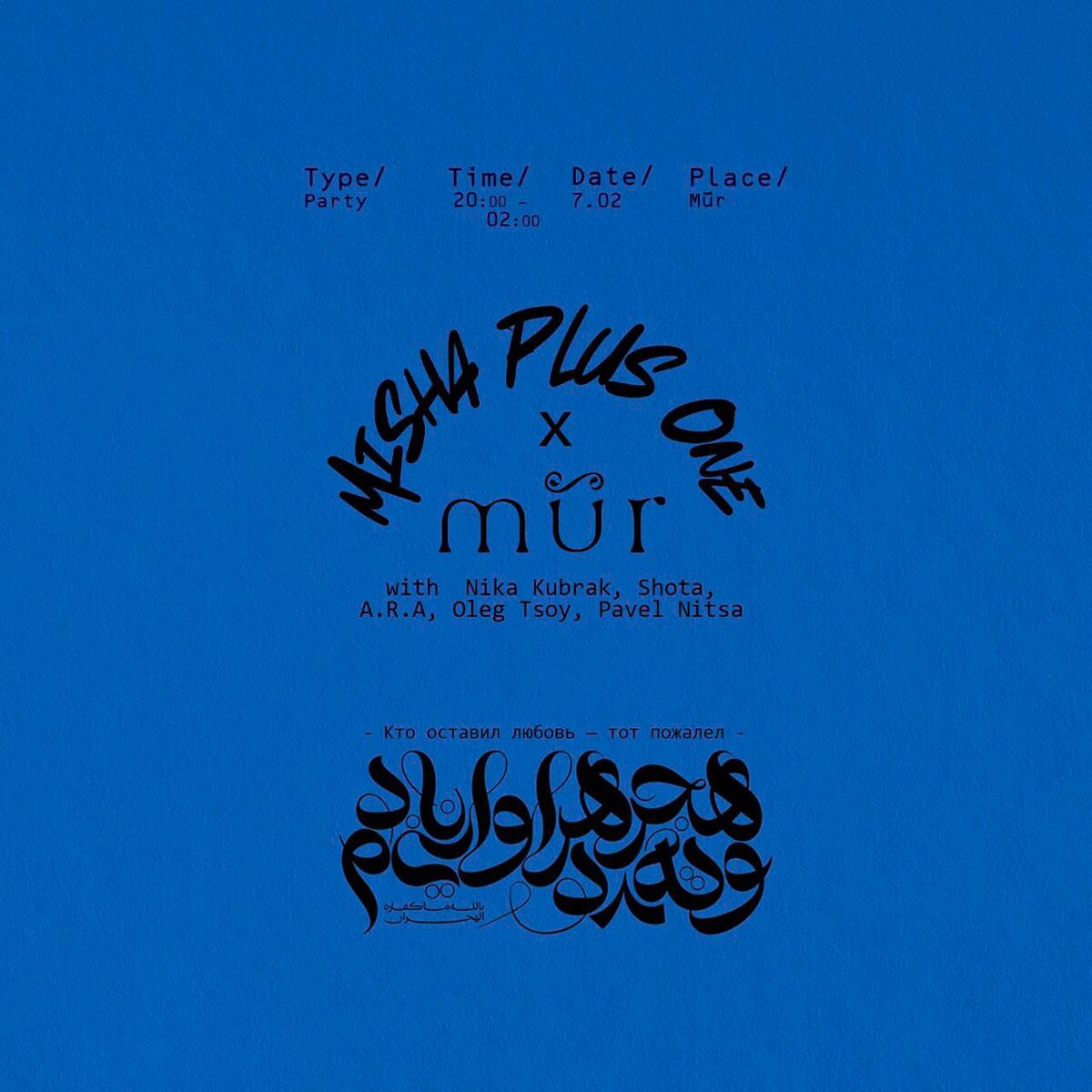 7.02 20:00–04:00 В ресторане mür запускают новое течение — вечеринки. Дыхание побережья в каждой детали, голос океана слышен даже в напитках, а музыка, движение и танец — логическое продолжение ресторана. Сначала ужин в 20:00, далее старт вечеринки в 22:00. Первую музыкальную ночь устраивают уже 7 февраля вместе с «Миша Плюс Один». D’Maselle Shota Nika Kubrak A.R.A Tsoy+Nitsa 🎫 Билеты FC/DC, 21+ 📆 7 февраля, 20:00–04:00 📍Mur, Столярный пер., 3, корп. 16, Москва