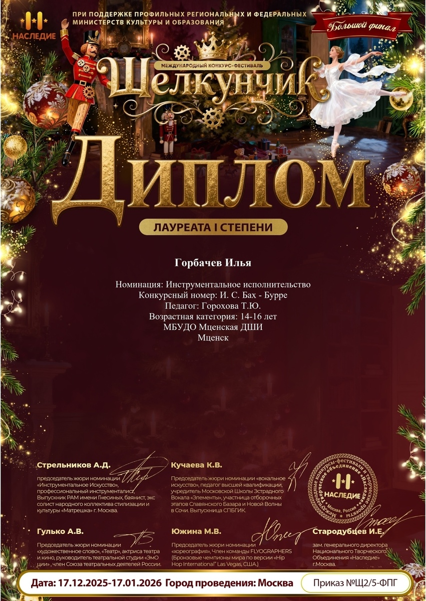 Юные мценские артисты стали лауреатами Международного конкурса-фестиваля «Щелкунчик» Воспитанники Детской школы искусств города Мценска получили дипломы лауреатов Международного конкурса-фестиваля «Щелкунчик». Илья Горбачев, Виктория Родина, Ратмир Смирнов и Павел Тарасов (класс преподавателя Татьяны Гороховой) получили дипломы лауреатов 1-й степени в номинации «Инструментальное исполнительство». Павел Тарасов также получил диплом лауреата 1-й степени Закрытой национальной премии в сфере культуры, творчества и образования в рамках финального смотра лучших исполнителей и коллективов 2025 года Сulturia, диплом лауреата 1-й степени Международного конкурса-фестиваля образовательных инициатив имени П. И. Чайковского «Вальс цветов». - Поздравляем наших талантливых гитаристов, - сказали в Мценской ДШИ. - Каждый аккорд, каждая мелодия – это результат долгих часов репетиций, терпения и любви к музыке. Вы доказали, что талант плюс упорство равно успех! Желаем вам новых музыкальных открытий,