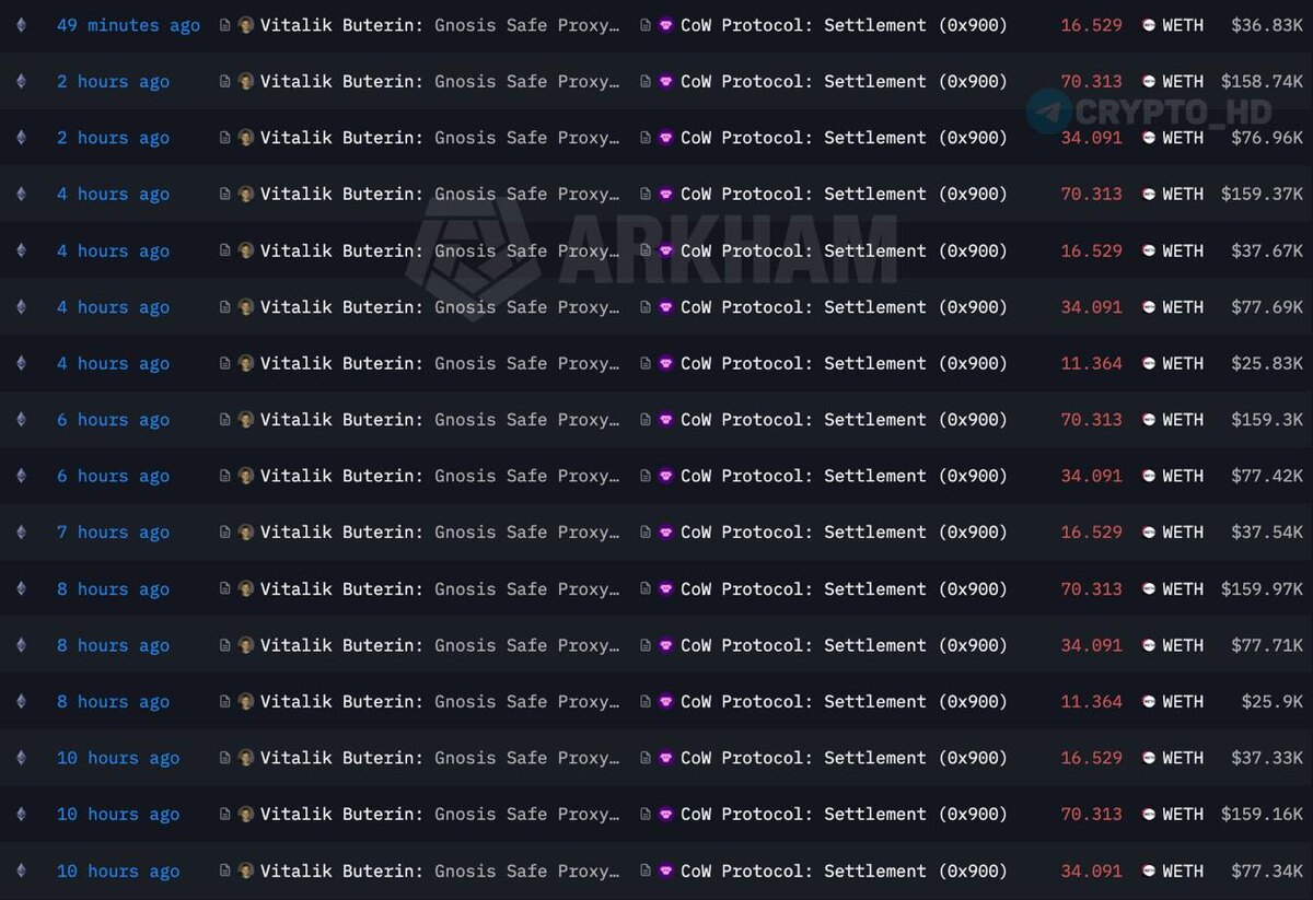 … За последние 2 дня он продал ETH за $3,300,000 – основатель Ethereum отправляет эти деньги в благотворительный фонд Kanro, который создан для финансирования исследований в области здравоохранения. Сейчас запущен 4-дневный TWAP (Time-Weighted Average Price) – в его рамках планируется продать ETH на $7,300,000. Crypto Headlines