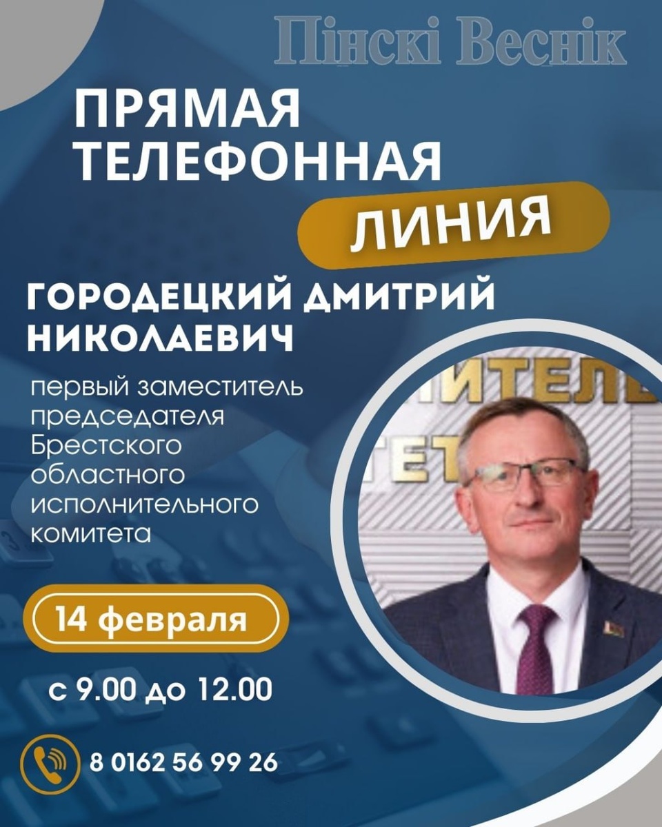 14 февраля 2026 года с 9.00 до 12.00 часов состоится прямая телефонная линия с первым заместителем председателя Брестского областного