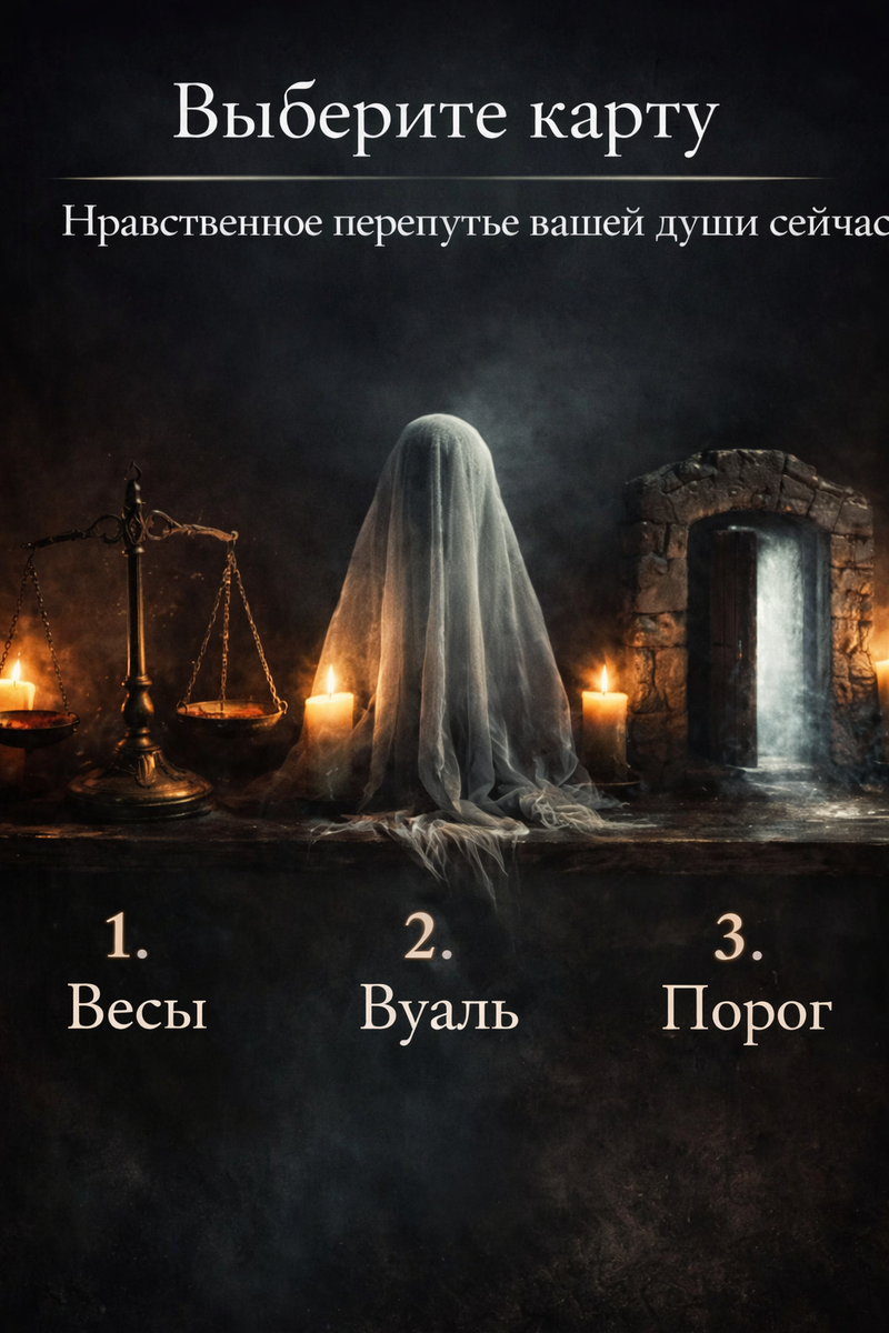 Выберите карту, не торопясь и не подглядывая, как на экзамене у судьбы. Стопки. Стопка 1 - Весы. Стопка 2 - Вуаль. Стопка 3 - Порог. Ваше перепутье здесь - про Справедливость против самопожертвования, про то, где заканчивается долг и начинается стирание себя.
