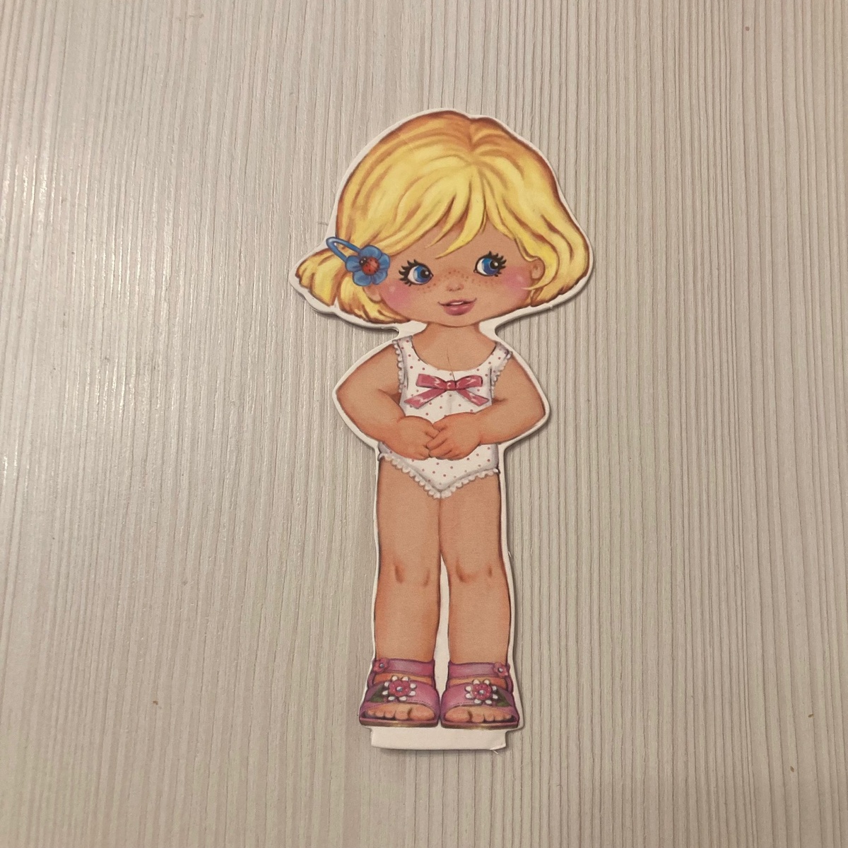 Всем добрый день! Что-то задержалась я со статьей на этой неделе. Хочу сегодня показать вам одну милую малышку. Если вы меня давно читаете, то, наверное, уже устали от моей регулярной фразы "Я вообще-то не собираю кукол-детей, но...". Вот и в этот раз случилось со мной такое же "но". Куколка покорила меня с первого взгляда. Ведь правда же, она очаровашка? И этот озорной и кокетливый взгляд вбок... Зовут ее Кристина. Куколка маленькая, всего 15 см, напечатана на плотном картоне и уже вырезана. К ней прилагаются шесть нарядов. Вот этот, ниже, пожалуй, мой самый любимый, такой он уютный и одновременно трогательный: А теперь оденемся по погоде: И скорее в лес, лыжня зовет! Но к весне тоже стоит приготовиться заранее: Пока не верится, но скоро, скоро нам понадобятся и зонтики, и резиновые сапожки. А там уже и до лета рукой подать. Ко всем нарядам Кристины прилагаются головные уборы. Костюмчик выше - не исключение, к нему идет огромный голубой бант. Но мне не нравится, как он смотрится на ку