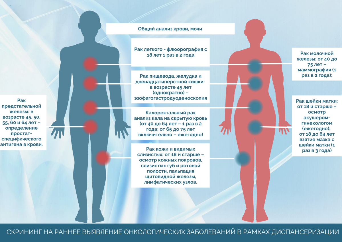 Онкологические заболевания стали очень коварны: на текущий момент они «помолодели» и протекают, в основном, бессимптомно. Чтобы выявить злокачественные образования на ранних стадиях, медицинские учреждения проводят массовые скрининги. Именно комплекс мероприятий помогает охватить как можно больше пациентов и выявить предраковые и раковые заболевания. Скрининг позволяет выявить часто встречающиеся злокачественные локализации – это рак толстой кишки, молочной железы, лёгкого, шейки матки, рак лёгкого, рак предстательной железы. Что подразумевает онкоскрининг в рамках диспансеризации? У женщин это проведение маммографии и онкоцитология (взятие мазка с поверхности шеечного канала и шейки матки с целью определения раковых изменений). У мужчин – анализ крови на простатический специфический антиген (ПСА), который проводится для диагностики рака простаты и аденомы простаты. И мужчинам, и женщинам необходимо проходить флюорографию. В определённом возрасте также назначают анализ кала на скрытую