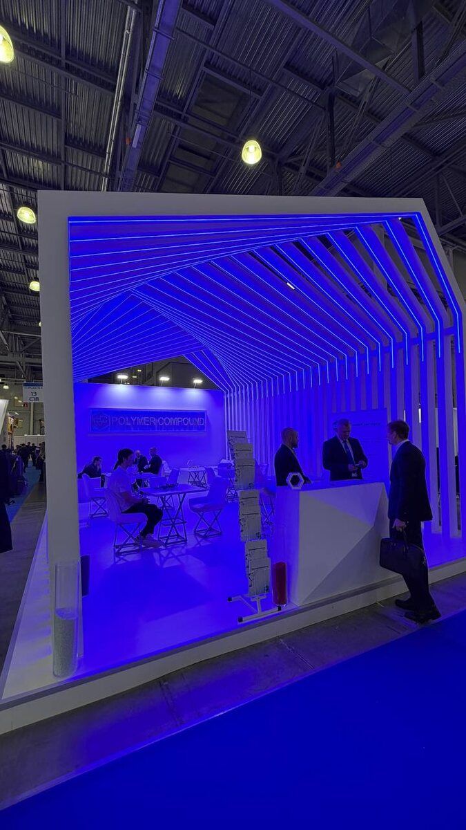 На Рупластике 2026 был обнаружен такой стенд. Конструкция не стандартная, нужно прямо сказать. Свет внутри выбран не удачно. Синий свет вреден при длительном воздействии. Целый день работать внутри стенда, мне кажется, проблематично.