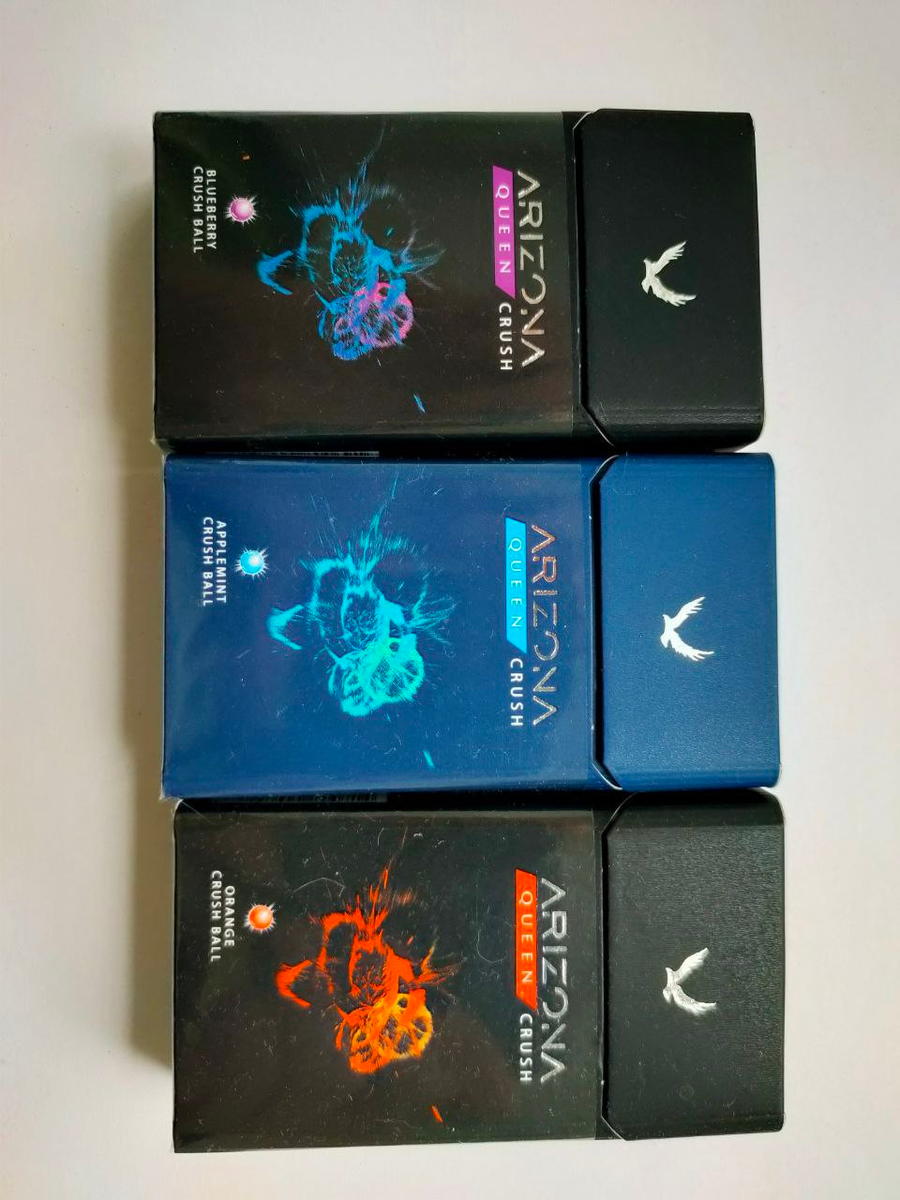 Всем привет. Сегодня про ARIZONA QUEEN CRUSH. Ко мне приехали сразу три вкуса - яблоко, апельсин и черника. Разберу каждый, но сначала - упаковка и сами сигареты. Тут стоит блок-диспенсер - я такие обожаю. Открыл, достал, закрыл. Ничего не рвётся, не мнётся, не бесит. Пачка строгая, без страшных картинок. И при этом выглядит бодро: синий или чёрный фон, на нём что-то вроде взрыва-реакции - смотрится эффектно, не как «очередная ноунейм пачка».