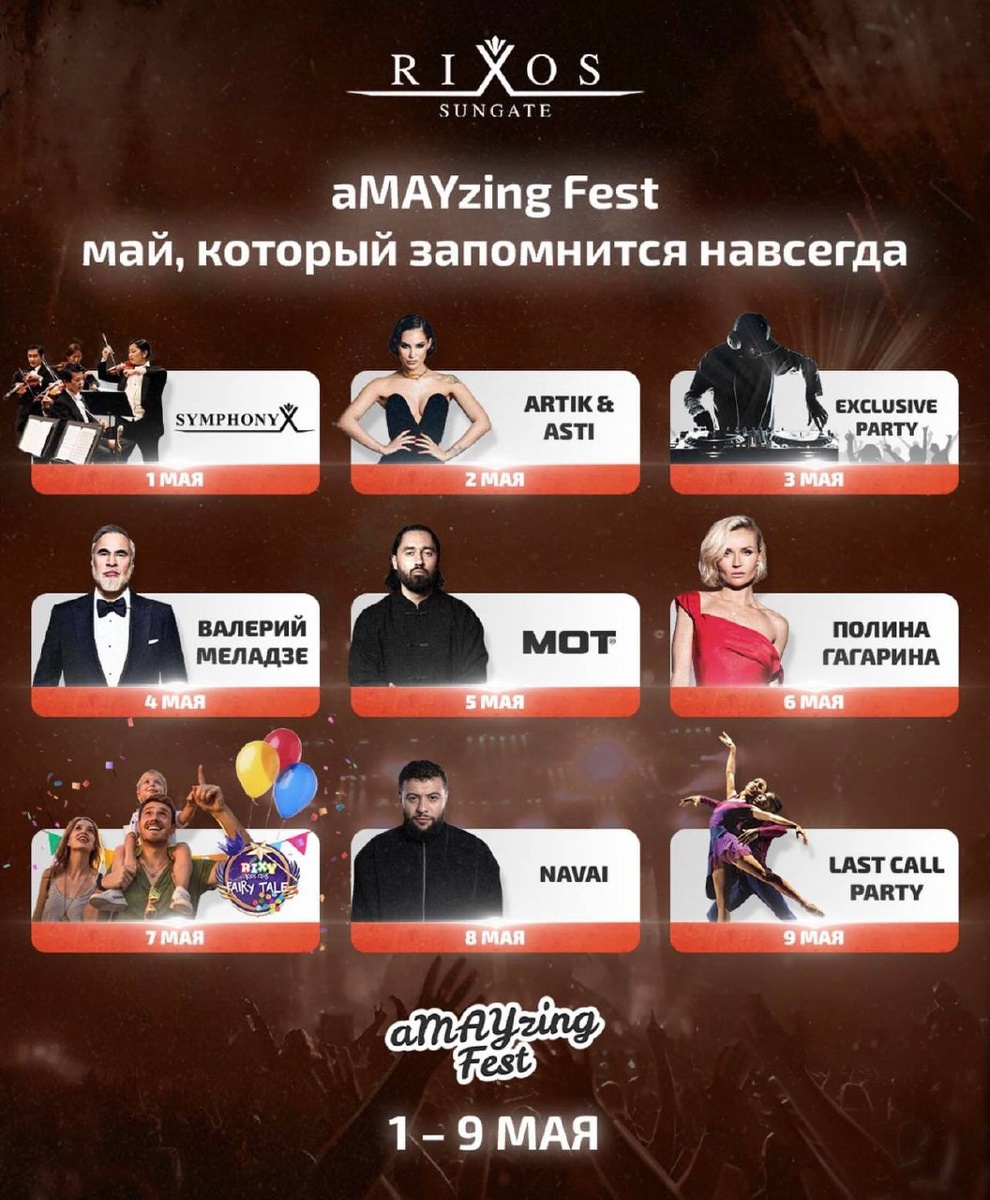 В 2026 году Турция окончательно закрепляет новый формат отдыха: живые концерты топ-артистов прямо на территории отелей. Без покупки билетов, всё уже включено в проживание. Ниже — актуальный календарь музыкальных событий в отелях Турции на сезон 2026. RIXOS SUNGATE — MAY FEST 2026 ⭕️Регион: Кемер ⭕️Даты фестиваля: 1–9 мая 2026 ⭕️Формат: фестивальная неделя — концерты, шоу и вечеринки почти каждый день • 2 мая — Artik & Asti • 4 мая — Valery Meladze • 5 мая — Mot • 6 мая — Polina Gagarina • 8 мая — Navai DOBEDAN WORLD PALACE — КОНЦЕРТНЫЙ СЕЗОН 🟠Период: май – сентябрь 2026 • 4 мая — Mot • 6 мая — Burito • 20 мая — Mandinga • 10 июня — Masha Sheix • 17 июня — Mandinga • 24 июня — Hanna • 8 июля — Vintage • 15 июля — Yuliya Savicheva • 22 июля — Akmal • 5 августа — Mikhail Shufutinsky • 12 августа — Hanna • 26 августа — Burito • 2 сентября — Eva Vlasova • 9 сентября — Mandinga • 23 сентября — Vintage VICTORY HOTELS ⭕️Отели: Victory Resort / Be Mine / Volare ⭕️Регион: Сиде ⭕️Период