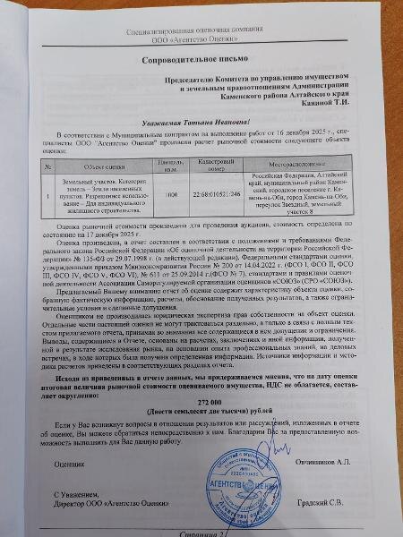 Название: Площадью 1000 кв.м, с кадастровым номером 22:68:010521:246, с разрешенным использованием для индивидуального жилищного строительства Канал: Госземля Алтайский край Область: край Алтайский Район: м.р-н Каменский г.Камень-на-Оби Населенный пункт: пер. Звёздный, 8 Локация: Смотреть на карте ВРИ: Жилая застройка Кадастровый номер: 22:68:010521:246 Кадастровая стоимость: - Вид сделки: Продажа Площадь: - Начальная цена: 272000.00 руб. Дата завершения: 28.02.2026 Подробнее: ГИС ТОРГИ #госземля #земляотгосударства #земля #земельныйучасток #земельныеторги #торги #аукцион #продажаземли #продажа #алтайскийкрай