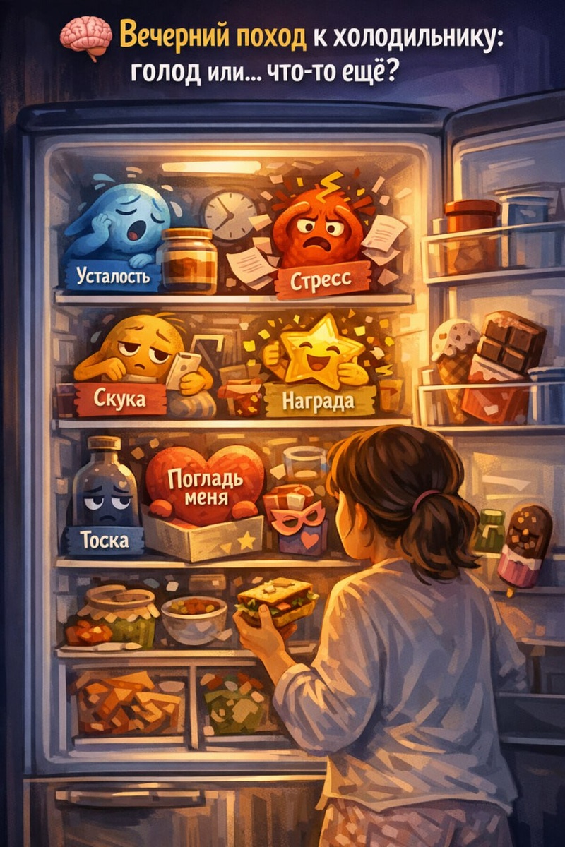 ? ❗️Знакомо: день окончен, вы дома, и рука сама тянется к холодильнику. Но часто ли там на самом деле живёт голод? Давайте разберемся. 🍿Представьте, что ваш холодильник — это не просто шкаф с едой. Это «эмоциональный холодильник». И вечером мы чаще всего идём к нему не за калориями, а за чем-то совсем другим. ❓Что вы кладёте в него в течение дня? 📍Невысказанную усталость? 📍Загнанный вглубь стресс от рабочих задач? 📍Лёгкую скуку и нехватку впечатлений? 📍Желание удовольствия и награды за сложный день? Вечером, оставаясь наедине с собой, мы пытаемся «достать» эти спрятанные чувства. Но вместо эмоций в руках оказывается бутерброд или шоколадка.🍰 🔍 Эксперимент на неделю: «Карта вечерних желаний»🌶 Перед тем как открыть дверцу, остановитесь на 60 секунд и задайте себе два вопроса: «Что я сейчас чувствую?» (Усталость, раздражение, пустота, тревога, скука?) «Чего мне на самом деле хочется?» (Отдохнуть, расслабиться, уединиться, почувствовать заботу, развлечься?) 🍭Запишите