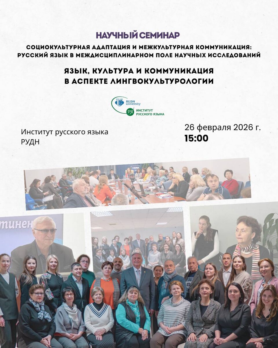«Социокультурная адаптация и межкультурная коммуникация: русский язык в междисциплинарном поле научных исследований» 📅 26 февраля 2026 года (четверг) ⏰ 15:00 (МСК) 📍Формат: смешанный 👩🏫 Семинар проводится кафедрой русского языка и лингвокультурологии Института русского языка РУДН имени Патриса Лумумбы в рамках научной школы «Лингвокультурология и профессиональное общение» (руководитель — д.ф.н., профессор В. В. Воробьёв) 🎯 Тема заседания: «Язык, культура и коммуникация в аспекте лингвокультурологии» 🧠 В фокусе обсуждения: ▫️ Лингвокультурология XXI века: актуальные вопросы ▫️ Основные проблемы коммуникативной лингвокультурологии ▫️ Языковая картина мира в современных медиа ▫️ Язык, культура и этнос в лингвокультурном осмыслении 📝 Регистрация 🔗 Подключение Яндекс. Телемост 🔎 Подробнее на сайте #кафедра_русского_языка_и_лингвокультурологии #ИРЯ_анонс