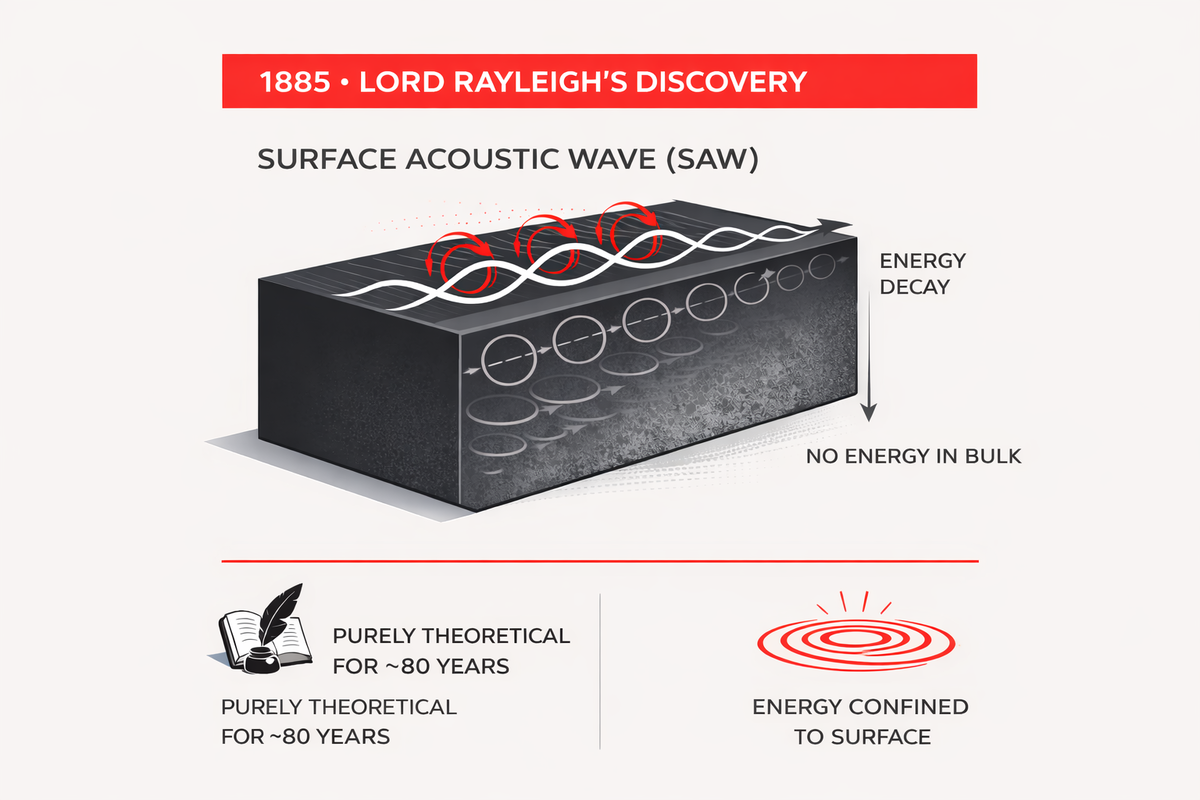 Знакомьтесь: ПАВ, или поверхностные акустические волны. Сегодня эта технология скрывается в тысячах банкоматов и сенсорных киосков. Но её история началась не в лаборатории Apple, а в кабинете британского аристократа почти 140 лет назад. Представьте Англию конца XIX века. Лорд Рэлей (да-да, тот самый Джон Уильям Стретт) делает чисто теоретическое открытие: описывает странные волны, которые «ползут» по поверхности материалов. Это и есть ПАВ — поверхностные акустические волны. Учёный мир пожал плечами: «Любопытно, но бесполезно». Так технология и пролежала на полке почти 100 лет, пока... Всё изменилось в солнечном Беркли. Два учёных, Уайт и Воллмерт, создали крошечное устройство — цифровой преобразователь. Оно могло «разговаривать» с теми самыми волнами Рэлея., и переводить на цифровой язык данные этой волны Внезапно ПАВ из научного курьёза превратилась в технологическую суперзвезду. Но главное было впереди. Американец Сэмюэл Хёрст додумался до гениального: а что, если этими волнами лов
