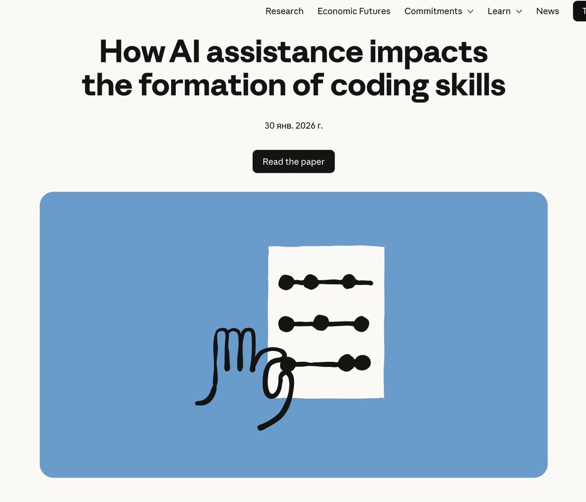 ИИ ускоряет работу, но может замедлять рост навыков, если на него слишком сильно опираться во время обучения. Как проводили эксперимент Сделали рандомизированное исследование: - 52 разработчика - никто не знал Python-библиотеку Trio - всем дали небольшую задачу - половине разрешили пользоваться AI-помощником - половине — нет После выполнения задания всех протестировали без ИИ, чтобы проверить реальные знания. Результат Группа с ИИ показала результаты на ~17% хуже: - без ИИ: ~67% - с ИИ: ~50% Самая сильная просадка — в дебагинге, то есть поиске и исправлении ошибок. Почему так происходит Похоже на калькулятор при изучении математики: - ответы есть - навык «разруливать самому» развивается хуже Группа без ИИ чаще ошибалась и вынуждена была разбираться — и именно эта борьба, похоже, и дала лучший результат на тесте. Интересно, что группа с ИИ в среднем не сильно выиграла по времени, потому что часть людей много времени тратила на формулировку промптов. Но есть нюанс Исследов