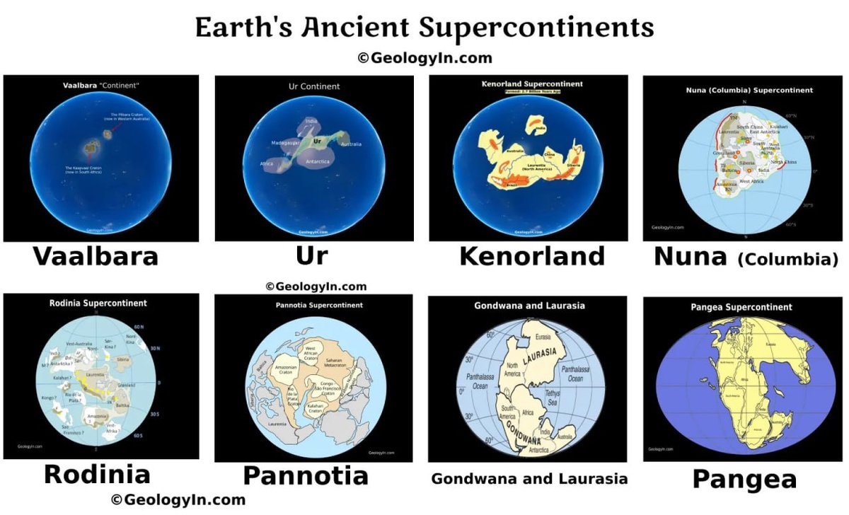 Пангея, суперконтинент, который распался 200 миллионов лет назад и образовал современные континенты, был как минимум пятым суперконтинентом в циклической истории формирования и распада суперконтинентов на Земле.