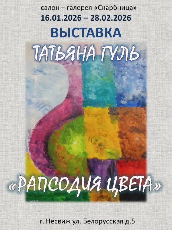 🖼 С 16 января по 28 февраля 2026 года в салоне‑галерее «Скарбница» проходит выставка ТАТЬЯНЫ ГУЛЬ «РАПСОДИЯ ЦВЕТА