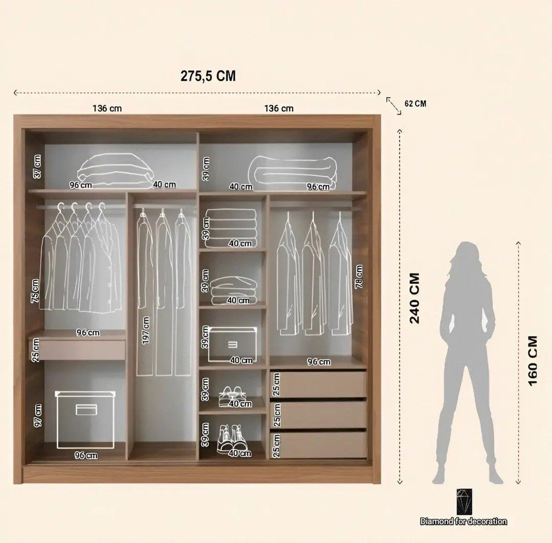 Эта схема подходит для классического шкафа-купе шириной от 1 метра. Схема 2: Компактная гардеробная для небольшой спальни