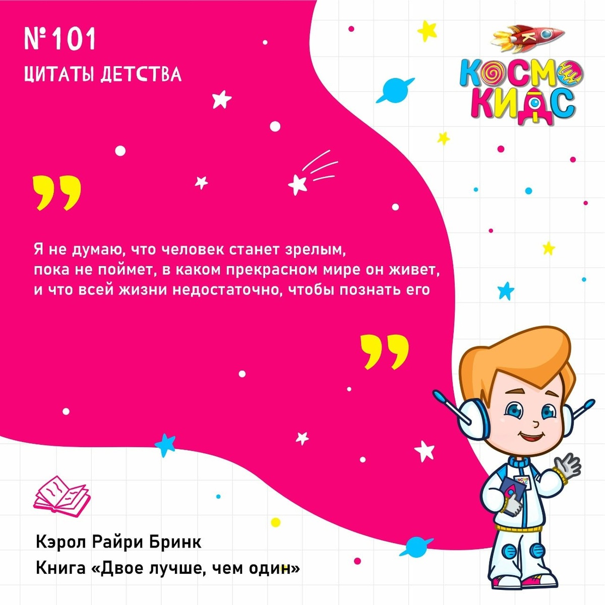 «Я не думаю, что человек станет зрелым, пока не поймет, в каком прекрасном мире он живет, и что всей жизни недостаточно, чтобы познать его» Кэрол Райри Бринк, «Двое лучше, чем один» ------------------------— Ждём вас в детском саду и на занятиях в #КосмоКидс! Быстрая связь с нами: kosmokids.online #космокидс #детскийсад #дети #космокидсдетям #цитаты #детскиекниги #детскиецитаты