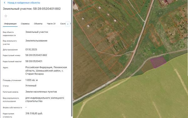 Название: Земельный участок из земель населенных пунктов с кадастровым номером 58:28:0520401:882, общей площадью 1855 кв.м., с видом