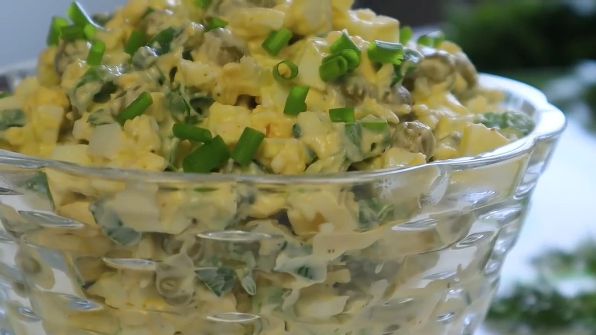 Этот салат - блюдо быстрого приготовления из минимального количества продуктов. В нём всё идеально подходит, дополняя друг друга. Нежный и мягкий, просто тает во рту. Его можно готовить, как на праздник, так и на каждый день. Он подходит к любым гарнирам и мясным блюдам. Начну с яиц. Отвариваю их и нарезаю небольшими кубиками. Выкладываю в салатник. Два плавленных сырка заранее кладу в морозильную камеру на 15 минут. После натираю их на крупной тёрке. Тёрку можно смазать растительным маслом, натирать будет легче. Добавлю их к яйцам. Консервированный зелёный горошек кладу. И нарезав пучок зелёного лука, добавлю его. Солю, перчу салат, добавляю майонез. Перемешиваю и салат готов. Бюджетно, прост