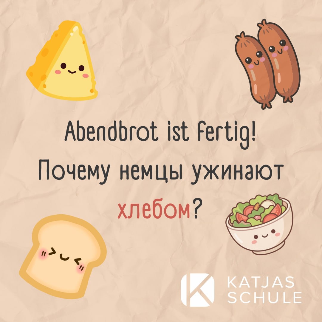 ☺️ Одно название немецкого ужина – Abendbrot – указывает, что это нечто необычное: вечерний хлеб. И это тот случай, когда название не врёт! Да: вечером немцы привыкли kalt essen (есть холодное). С 17 до 19 на столе появятся: 🍞 хлебушек – возможно, даже не один его сорт! 🍖 колбасы (Jagdwurst, Leberwurst, Gelbwurst, Schinken, Salami...) 🧀 сыры (Gouda, Tilsiter, Butterkäse...) 🥗 овощная нарезка (Gurken, Gewürzgurken, Radieschen, Tomaten...) 🥚 яичко для любителей бутербродов с яйцом (ein gekochtes Ei) 🐟 на севере Германии добавят маринованную сельдь (Bismarckhering) 🥗 а на юге – салат салат с колбасой (Wurstsalat) Но главное не набор ингредиентов, а возможность найти кусочек покоя в ежедневной рутине и воссоединиться с семьёй 🧦 🥨 А почему именно бутерброды именно вечером – читайте в наших карточках! 🔡 Учиться с нами